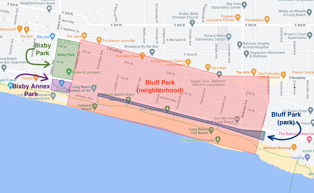 The thing is, what we called Bluff Park was just a piece of the actual Bluff Park, which really begins at South 36th Place and Ocean Boulevard and ends at the museum. And then there’s the fact that most of that area is considered to be the neighborhood of Bluff Park. Quite the mess, isn’t it?