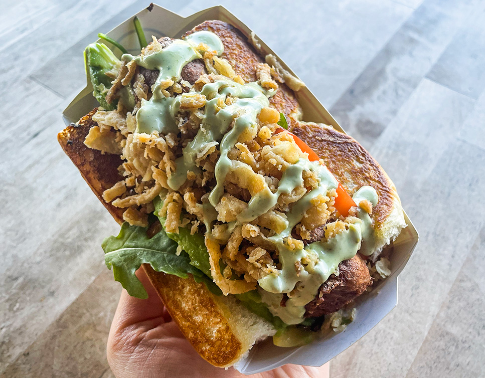 They’ve got a full bar, a huge selection of hot dogs, sausages, burgers, sliders and breakfast burritos. Plus, my two favorite things, happy hour and veggie options. On Tuesday, I endulged in the Sooo Veggie with a hot Italian Beyond Sausage, wild arugula, avocado, tomato, crispy onions and spicy basil aioli. They also offer meatless sliders. But there’s plenty of actual meat all over their menu—check it out here.