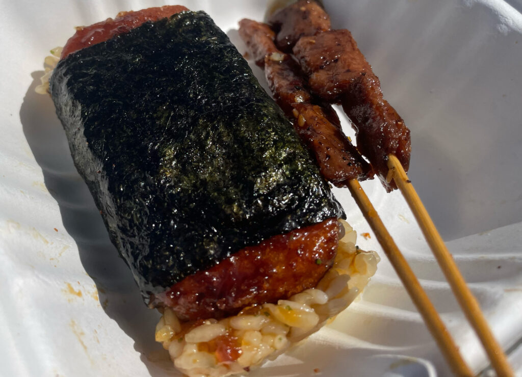It’s been way too long since I’ve had spam musubi, so obviously, it was the first thing I ordered when we arrived. They had “spam” musubi, “spam macsubi” and catsubi. We also snagged some “dollar hits” — chick’n pieces on a skewer.