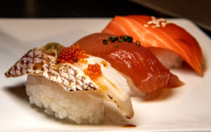 Sosogu, the newest addition to the Long Beach Exchange, offers a wide array of fresh sushi like these sashimi cuts of salmon, tuna and sea bream.