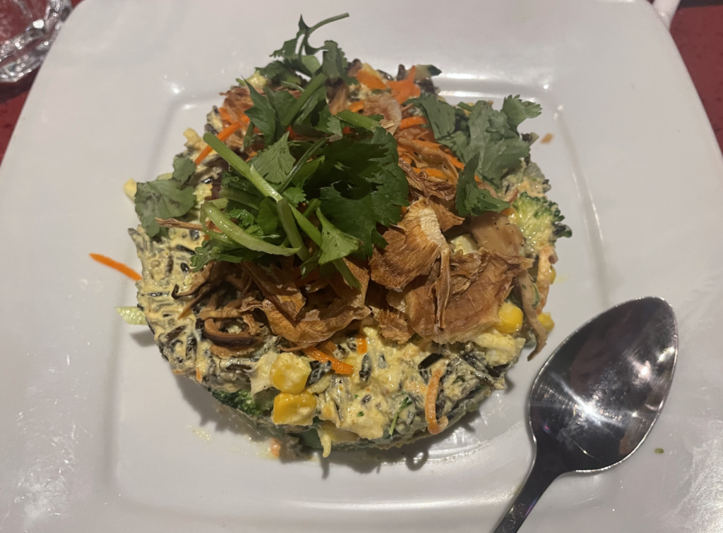 For our entrees, we shared two dishes, one cooked, one “living” (raw). Of the cooked variety, we got the Royal Noodle Soup (Bún Bò Huế): Lemongrass broth with round rice noodles, bologna, mushroom and beef served with bean sprouts, mixed herbs and cabbage. Off the raw menu, we ordered the curried rice: wild rice, broccoli, cauliflower, peas and corn in spiced macadamia sauce served over avocado, olives and cucumber, and topped with marinated mushroom, dehydrated crisp onion, fresh carrots and cilantro.