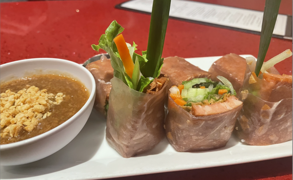 Eggrolls come with an eggless wrap with mushroom, carrot, jicama, clear rice noodles, taro and almond filling served with lettuce, mint and vegan fish sauce. Spring rolls are made with vermicelli, vegan shrimp, chive, lettuce and mint wrapped in brown rice paper served with peanut sauce.