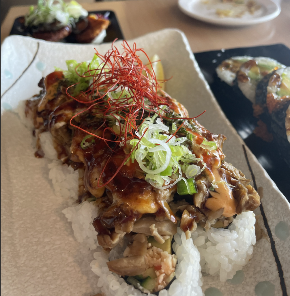 We tried I Lava You, a California roll with “baked oyster scallops”, dynamite sauce, spicy mayo and unagi sauce ($16). Then there was the Yoga Fire: Shrimp tempura, avocado, cucumber, spicy tuna and “spicy AF sauce.” Oh and don’t forget to start with a tempura blossom — miso-cream cheese stuffed blossoms with jalapenos and onion.