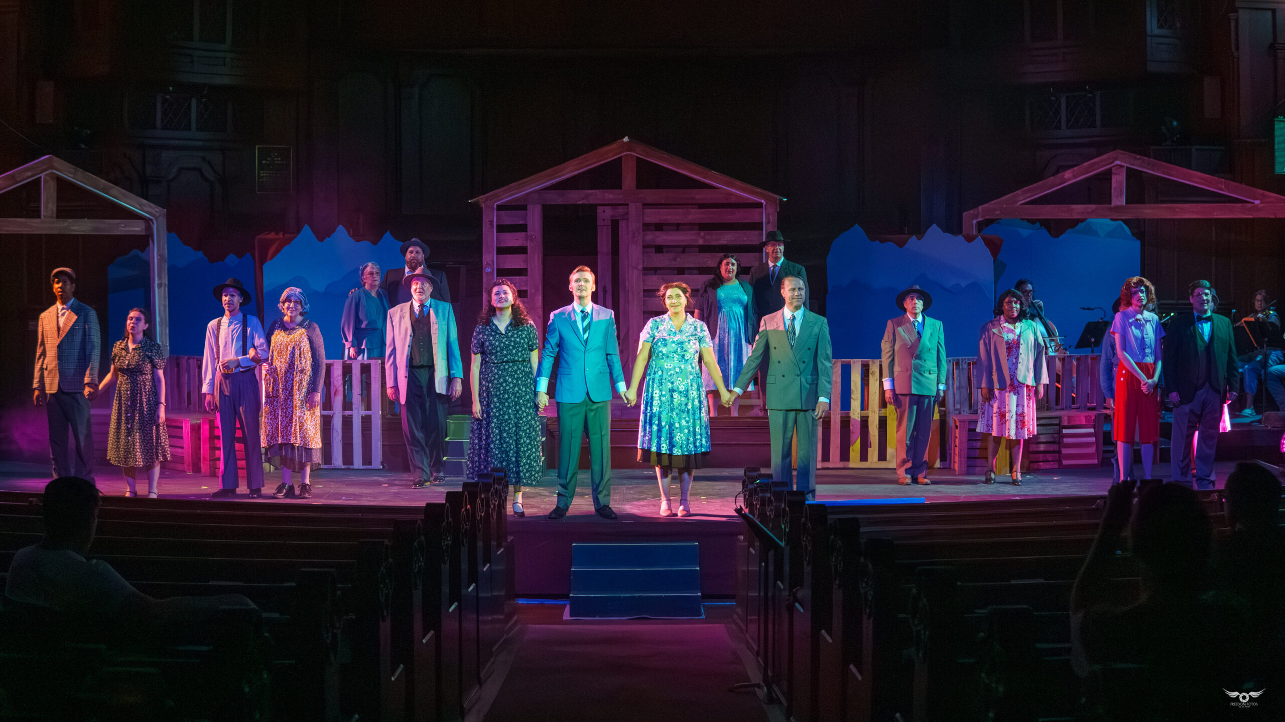 Much of the story’s deep emotion is conveyed through the musical’s nearly two dozen songs, with live music on stage (directed by Curtis Heard) featuring musicians on piano, banjo, bass, drums, cello, fiddle, viola and guitar performing riveting and catchy bluegrass tunes, with some solos.