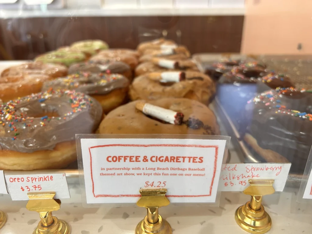Moonbridge’s “Coffee & Cigarettes” doughnut includes java chip icing and an Italian breadstick with “ash” made of Oreo cookie crumbs. Photo by Makenna Sievertson, LAist.