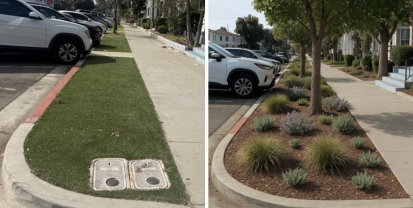 A battle is being waged in Long Beach, held on the small strips between the sidewalks and streets. The sides: plastics versus grass and dirt.