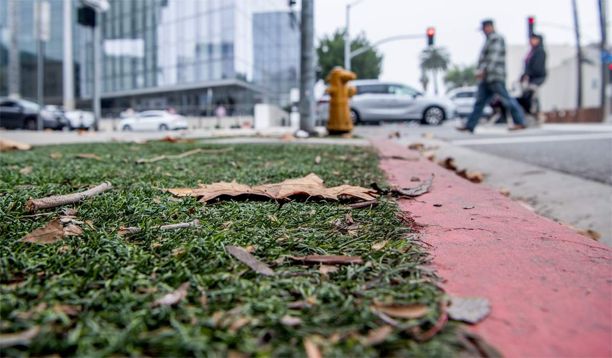A battle is being waged in Long Beach, held on the small strips between the sidewalks and streets. The sides: plastics versus grass and dirt.