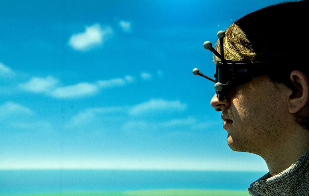 Their immersive VR system, the BeachCAVE, allows the team to test features relatively quickly. They prototype new technologies in the system and study how pilots behave. For example, as Whitney piloted the virtual aircraft at low altitude through the urban environment, he had to stick to a predetermined route. Any deviation could cause him to hit a building or end up in someone’s backyard. The researchers test how pilots respond to different cues, such as vibrations, to help them course correct.