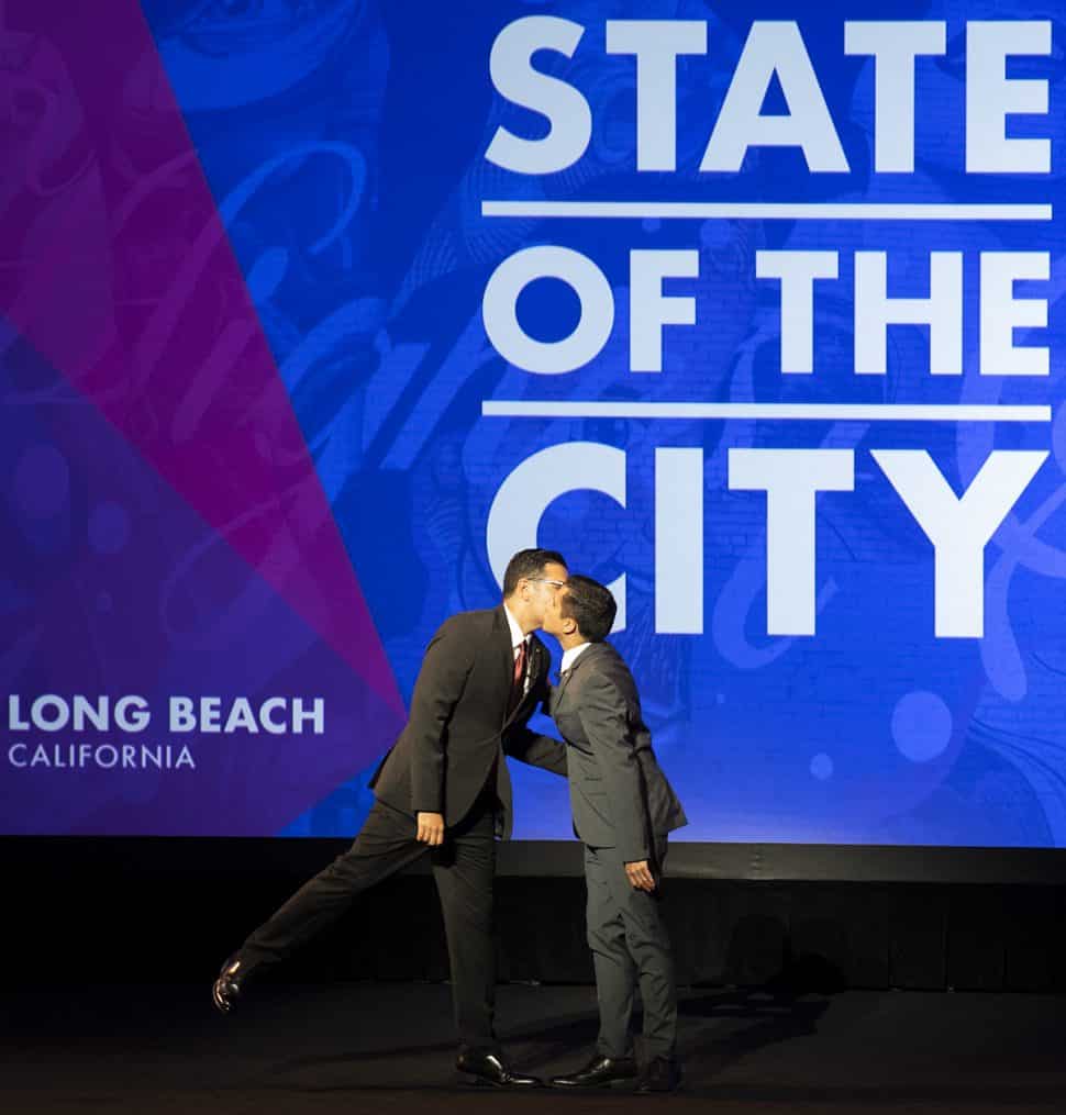 “Well if I look tan and rested, it’s because I just got back from my honeymoon last night,” is how Garcia opened his talk and he was greeted with warm applause. He then brought his husband, Matt Garcia—”The First Dude of Long Beach”—on stage and this happened (taken verbatim from speech script):