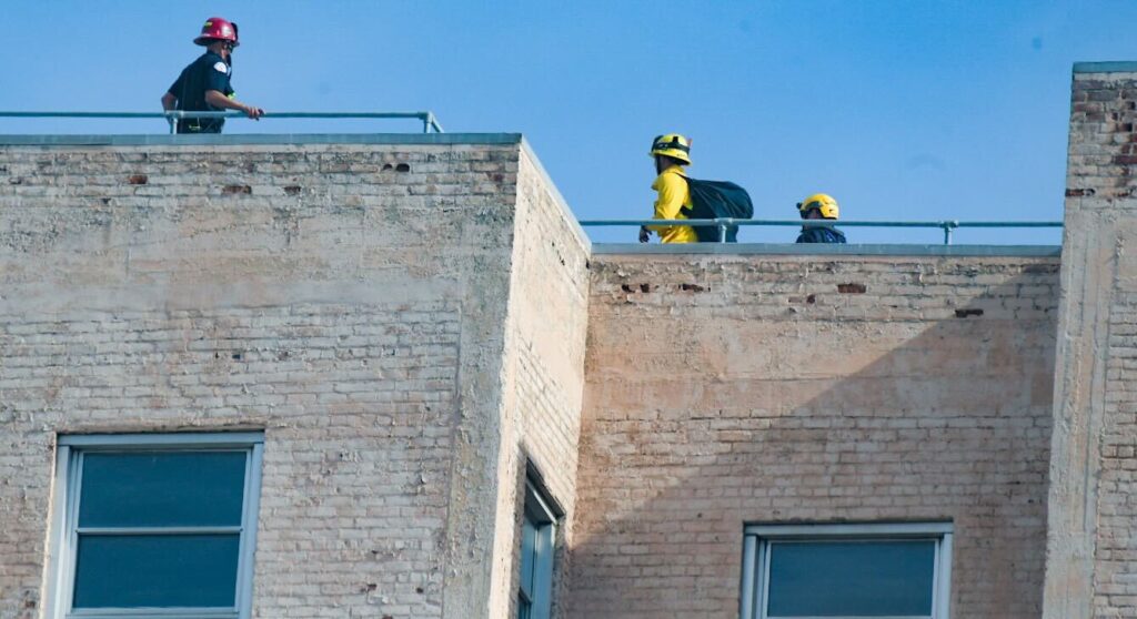 Police called in extra officers to shut down the street and radioed for an airbag to try to break the man’s fall if he jumped or tipped over the edge.