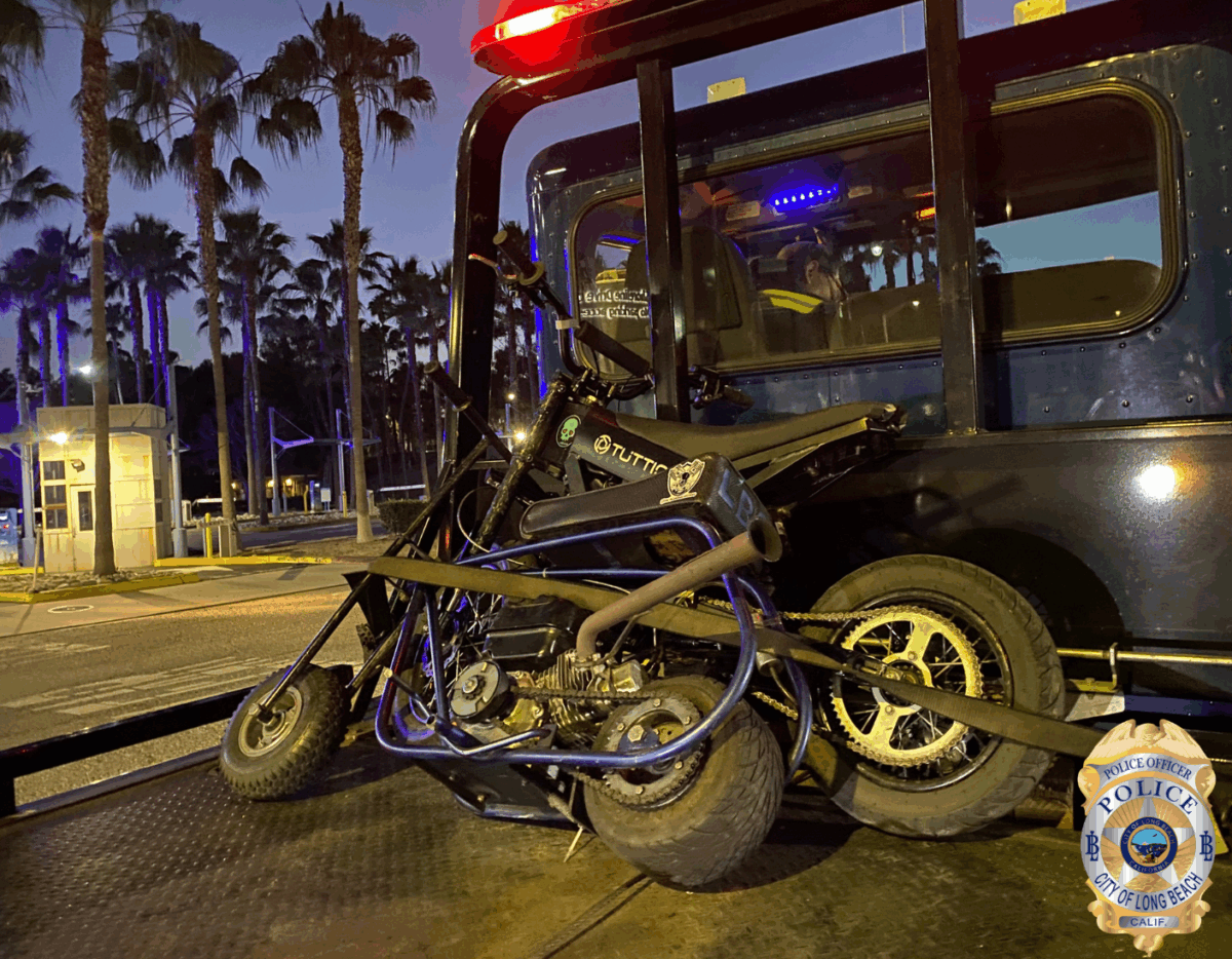 The Long Beach Police Department said that at about 4:20 p.m. Friday, officers “became aware of a group of approximately 50 subjects riding illegal e-motos, illegal pocket bikes, and e-bikes recklessly throughout the city.”