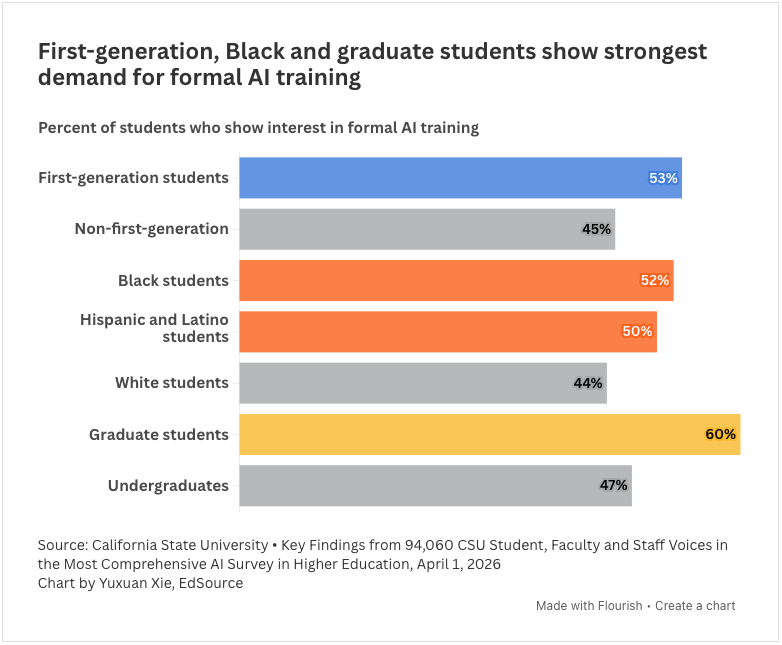 The 2025 survey shows that first-generation students are more interested in formal AI training and that Black, Hispanic and Latino students are more interested than white students. At San Diego State, students are required to earn a micro-credential in AI use during their first year — another change that was made after the 2023 survey.