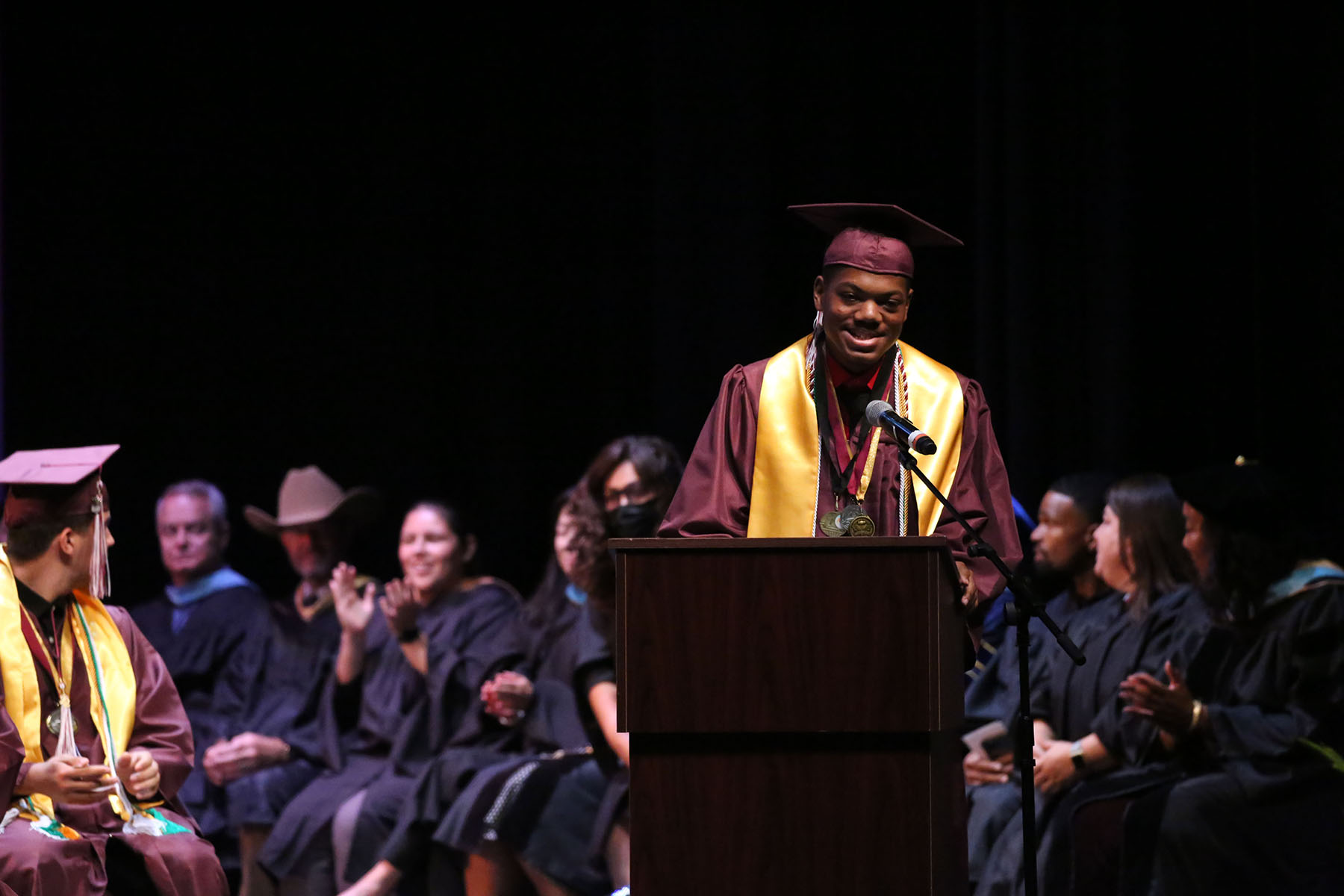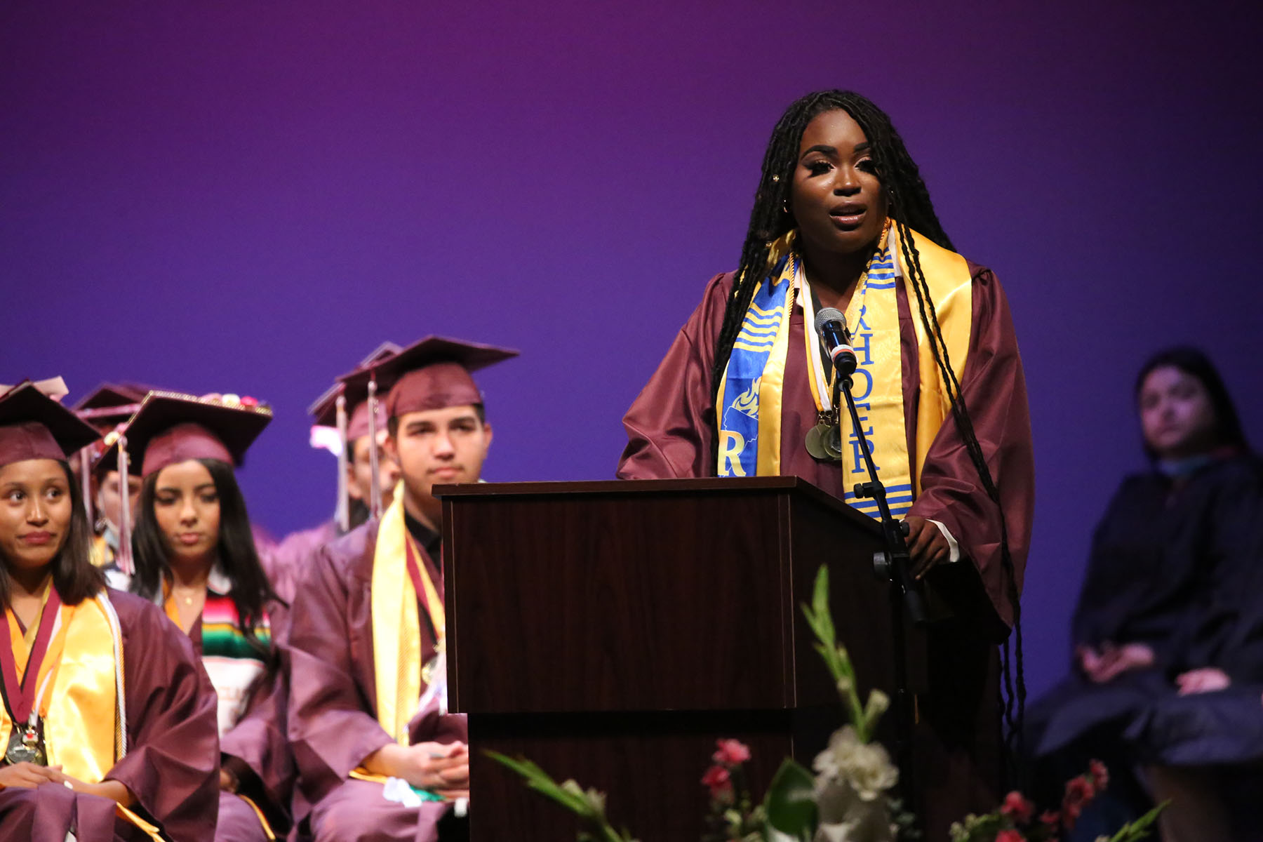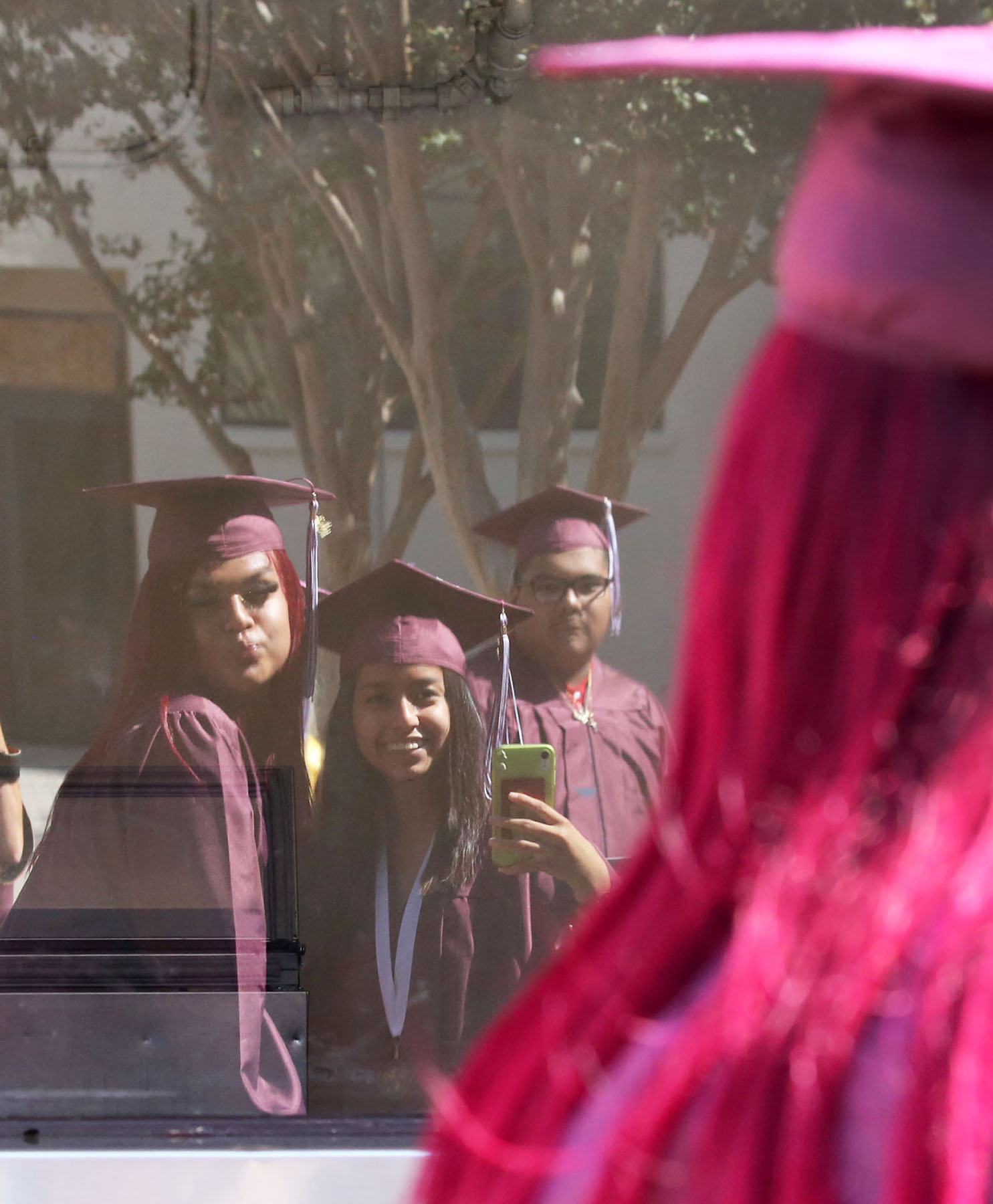 Seniors check out their reflection in a window as they wait for their graduation ceremony from Browning high school to begin in Long Beach on Wednesday, June 15, 2022. Photo by Tracey Roman.Students stop for a quick photo as they go into their graduation ceremony for Browning High School in Long Beach on Wednesday, June 15, 2022. Photo by Tracey Roman.Seniors decorate their hats for their graduation ceremony for Browning High School in Long Beach on Wednesday, June 15, 2022. Photo by Tracey Roman.Senior Class President Anthony Hayes gives a welcome speech at Browning High School’s graduation ceremony in Long Beach on Wednesday, June 15, 2022. Photo by Tracey Roman.Kalise Barrow speaks of strength and resilience at Browning High School’s graduation ceremony in Long Beach on Wednesday, June 15, 2022. Photo by Tracey Roman.Giovani Manfredi performs a song for the crowd at Browning High School’s graduation ceremony in Long Beach on Wednesday, June 15, 2022. Photo by Tracey Roman.Seniors of Browning High School take the stage at their graduation ceremony in Long Beach on Wednesday, June 15, 2022. Photo by Tracey Roman.Browning High School Principal Tomika Romant presents a diploma to Valedictorian Wilson Kong in Long Beach on Wednesday, June 15, 2022. Photo by Tracey Roman.Fermin Lopez is excited to to get a diploma at Browning High School’s graduation ceremony in Long Beach on Wednesday, June 15, 2022. Photo by Tracey Roman.A student shows us the money as he crosses to get his diploma at Browning High School’s graduation ceremony in Long Beach on Wednesday, June 15, 2022. Photo by Tracey Roman.Students turn their tassels at the conclusion of their graduation from Browning High School in Long Beach on Wednesday, June 15, 2022. Photo by Tracey Roman.Arianna Alvarez gives Brianna Cedilla a hug following their graduation from Browning High School in Long Beach on Wednesday, June 15, 2022. Photo by Tracey Roman.Students hug one another following their graduation ceremony from Browning High School in Long Beach on Wednesday, June 15, 2022. Photo by Tracey Roman.Kharisma Smith takes a photo with her family after graduation from Browning High School in Long Beach on Wednesday, June 15, 2022. Photo by Tracey Roman.