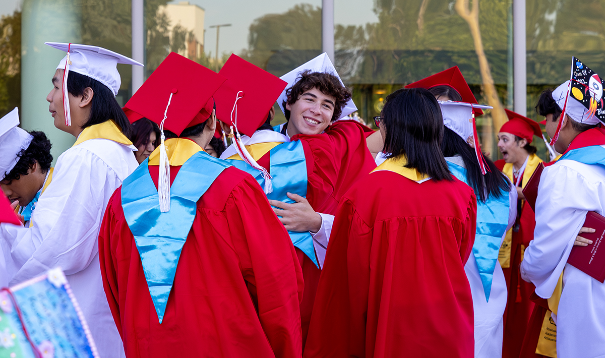 Sato Academy of Math and Science graduates hug after their commencement ceremony at the Carpenter Performing Arts Center on Thursday, June 8, 2023. Photo by Sarahi Apaez.