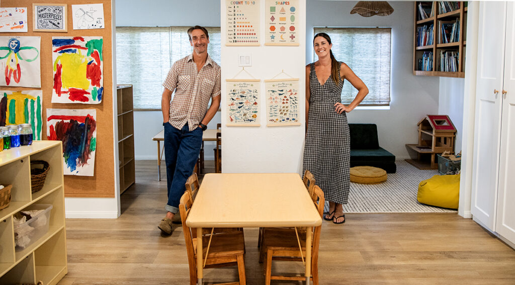 So on a tight timeline, they purchased the school for $900,000 in May. During the weeklong summer recess, the two put in another $100,000 in repairs, tearing down playsets, propping ladders, sanding chairs and applying multiple coats of paint. In the backyard, the two added astroturf, shade structures, a playhouse and mud kitchen.