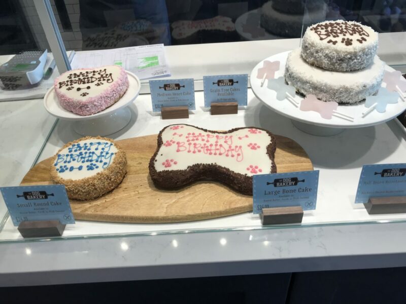 four cakes in a display case, for dogs. Two are small and round, one with pink and other with blue icing; one is bone shaped with pink icing, and other is larger, with brown icing and surrounded by bone-shaped birthday candles.