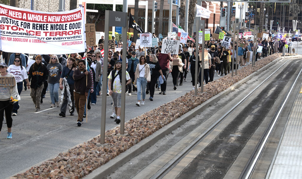 Approximately 400 people marched through downtown Long Beach Sunday afternoon to protest the federal government’s wave of aggressive immigration enforcement and agents’ recent killing of a man they’d wrestled to the ground in Minnesota.