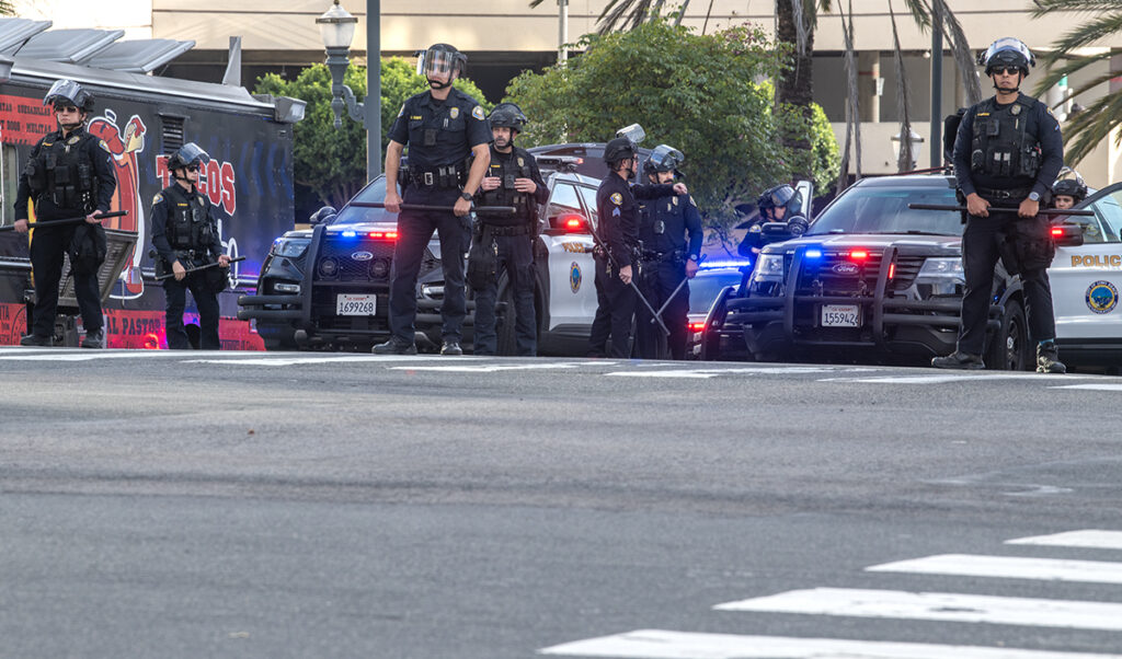 Protesters rallied at Pine Avenue and Third Street before taking to the streets, weaving along major roadways including Ocean Boulevard and Long Beach Boulevard, sometimes redirected by police lines.