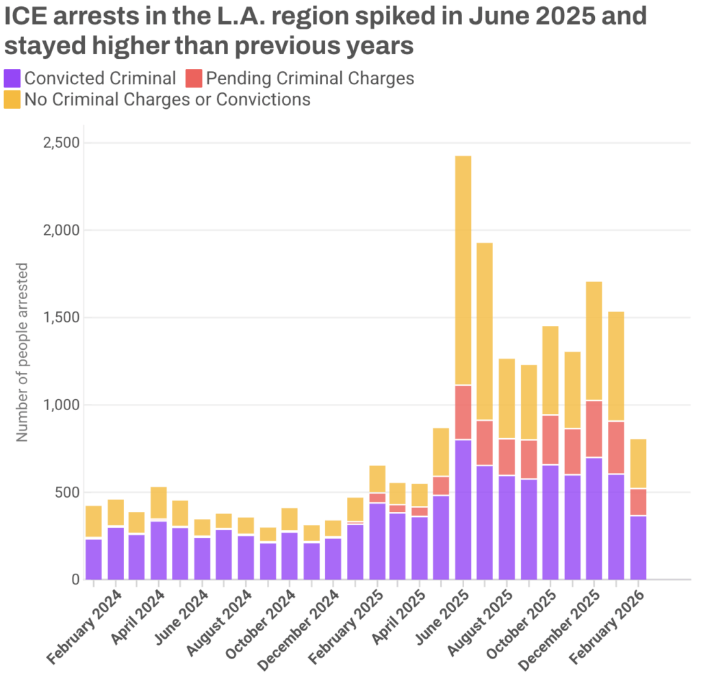 Federal immigration officials arrested more than 14,000 people in the greater Los Angeles area in 2025 — the majority of whom had no criminal record, according to an LAist analysis of new data from the Deportation Data Project.