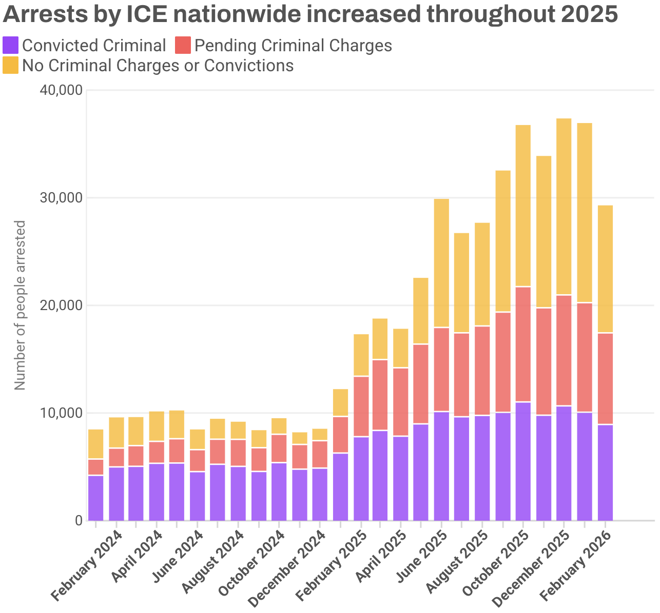 In 2025, federal officials arrested 14,394 people, up from 4,681 the year prior. Forty-six percent of people arrested had criminal convictions, 15% had pending charges, and 39% had no criminal charges or convictions.