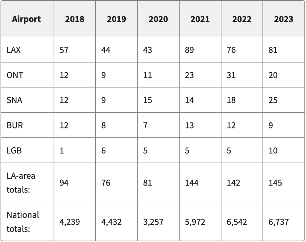Authorities said 145 firearms were brought to TSA checkpoints last year at LAX, Long Beach Airport, Hollywood Burbank Airport, John Wayne Airport in Orange County and Ontario International Airport.