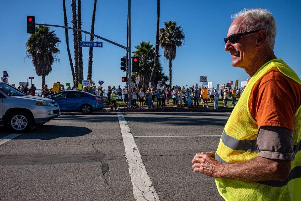 By 10 a.m., crowds were carrying signs and banners as they marched along Ocean Boulevard. Drivers honked in support, drawing cheers in response. By noon, the number of participants grew from the hundreds into the thousands, filling the sidewalks. Rallygoers showed off intricate signs and inflatable costumes.
