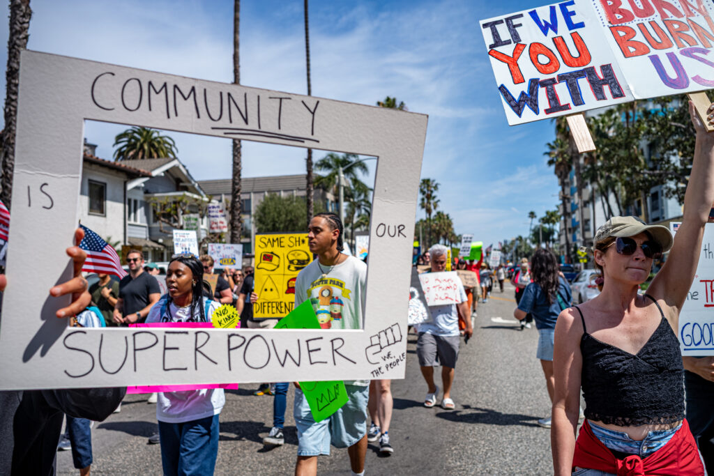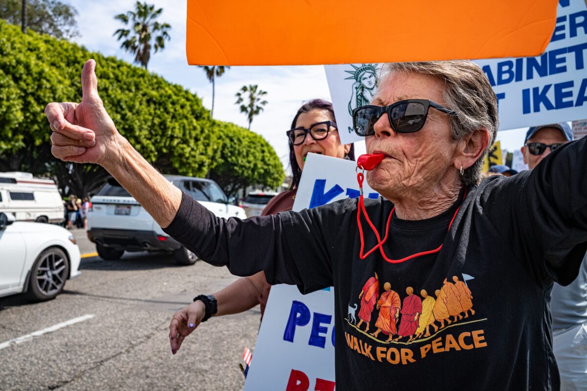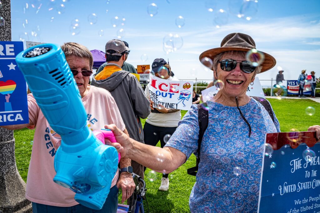 They chanted “People united, won’t be divided,” and waved signs with slogans like “impeach the mad king” and “ICE out!” As the rally began, police estimated at least 500 people already filled the sidewalks on both sides of Ocean near Temple Avenue, and that number soon swelled into the thousands — spilling into Bluff Park and Bixby Park.