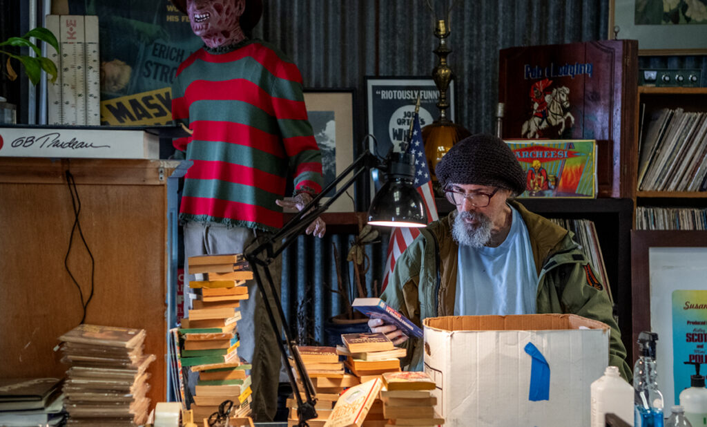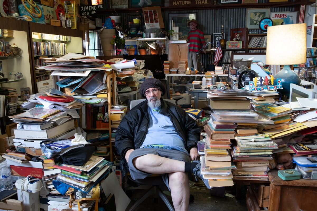 There’s also the trove of toys, postcards, movie posters and other antiquities that line the walls, counters and shelves throughout. In the back area — the workers call it the “nether world” — towering stacks of books form trench lines leading to an aging work computer, limited-edition prints and a bathroom which hasn’t worked properly since they moved there.
