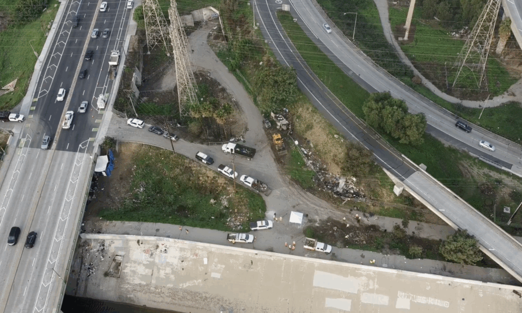 The cleanup, which spanned three days, Dec. 1 to 3, collected 150 tons of rubbish. Caltrans crews were seen in aerial footage corralling trash and uprooting tents, lean-to shacks and makeshift homes before setting up rocks and other barriers as a deterrent to future camps.