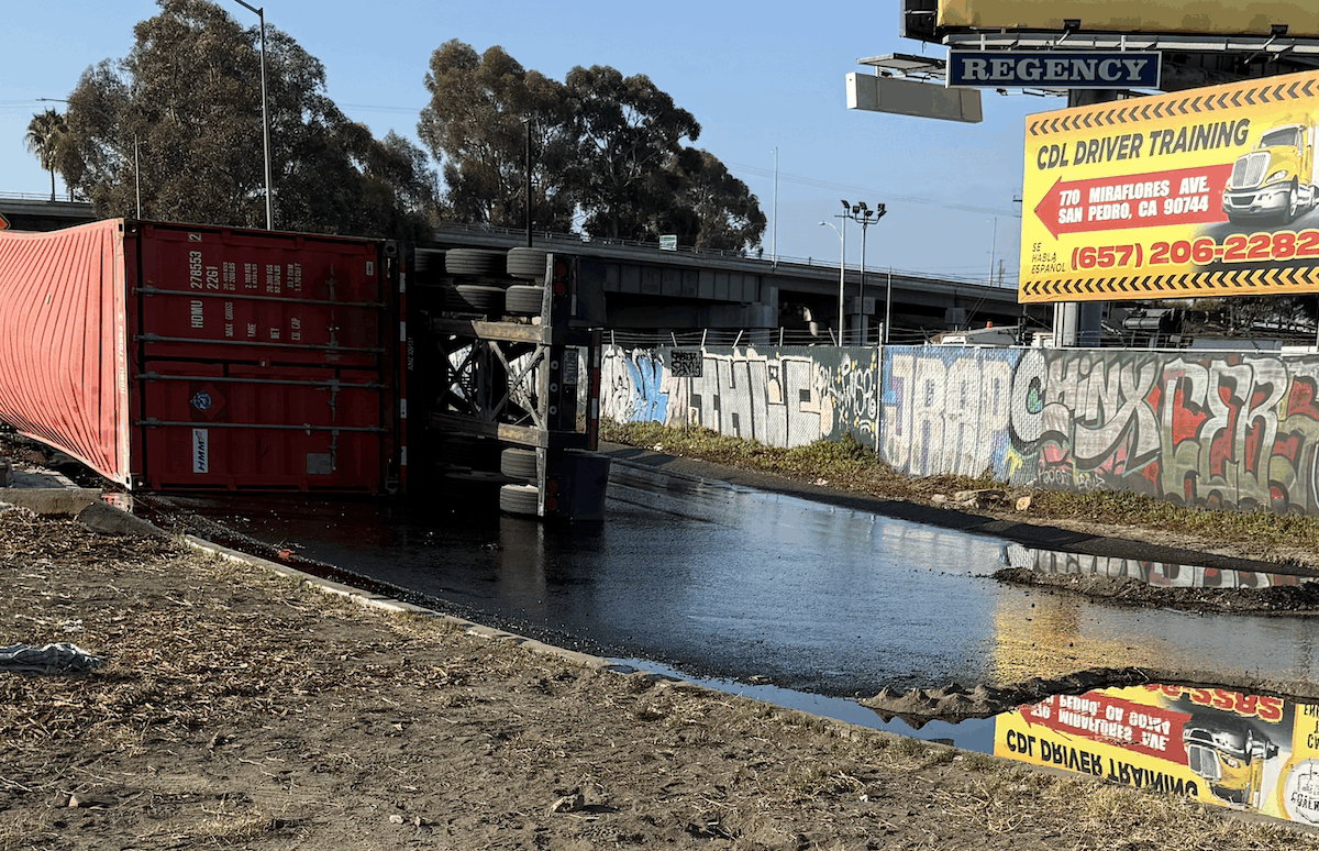 Tipped-over truck spills thousands of gallons of oil onto 710 Freeway in Long Beach
